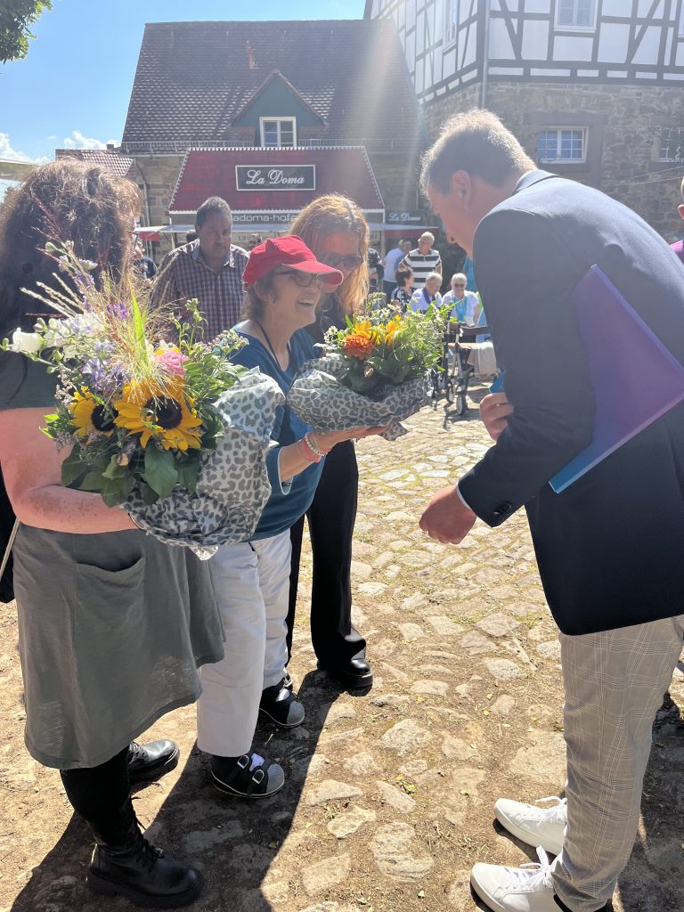 Ein bewegender Höhepunkt war die Ehrung der Bewohnerinnen und Bewohner, die seit 25 Jahren in Burguffeln zuhause sind. Vorstand Prof. Gerrit Jungk und Wohnverbundsleitung Alexander Theis überreichten ihnen Auszeichnungen und gratulierten den Jubilaren herzlich.