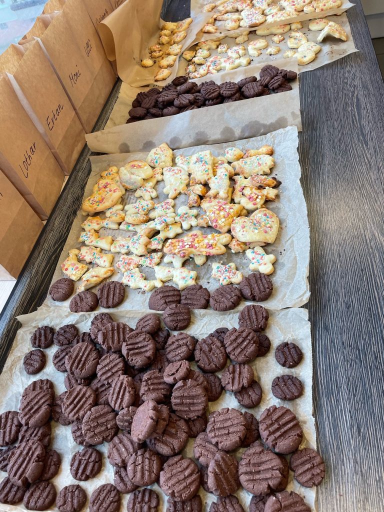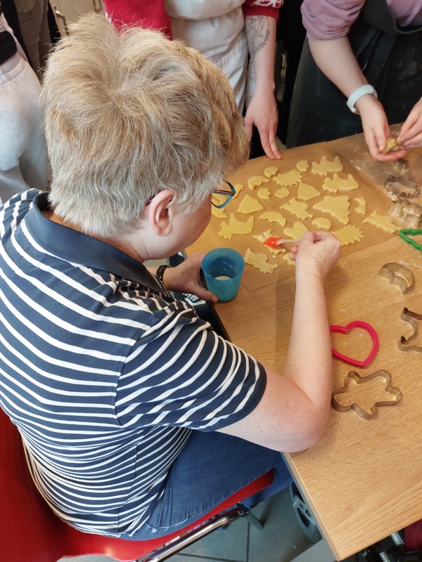 In diesem Jahr ist dieses Projekt mit der Kooperation der Elisabeth-Knipping-Schule, Kassel, auf Nachfrage der bdks ganz neu entstanden. Der Teig wurde bereits im Unterricht mit Schülern und Schülerinnen in der Schule am gestrigen Tag vorbereitet, und dieser konnte heute gemeinsam mit unseren Bewohnerinnen und Bewohnern ausgestochen, gebacken und verziert werden.